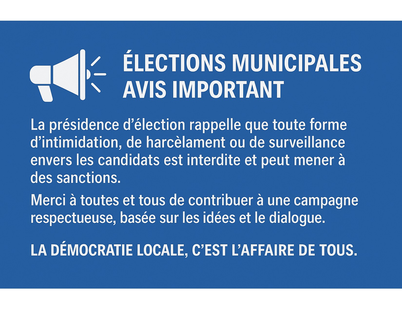 La Municipalité souhaite rappeler à l’ensemble des citoyens que toute forme d’intimidation, propos haineux, discriminatoire ou disgracieux visant le personnel municipal, électoral ou les candidats est strictement inacceptable et doit être dénoncée. Les élections doivent se dérouler dans le respect des lois et des personnes.