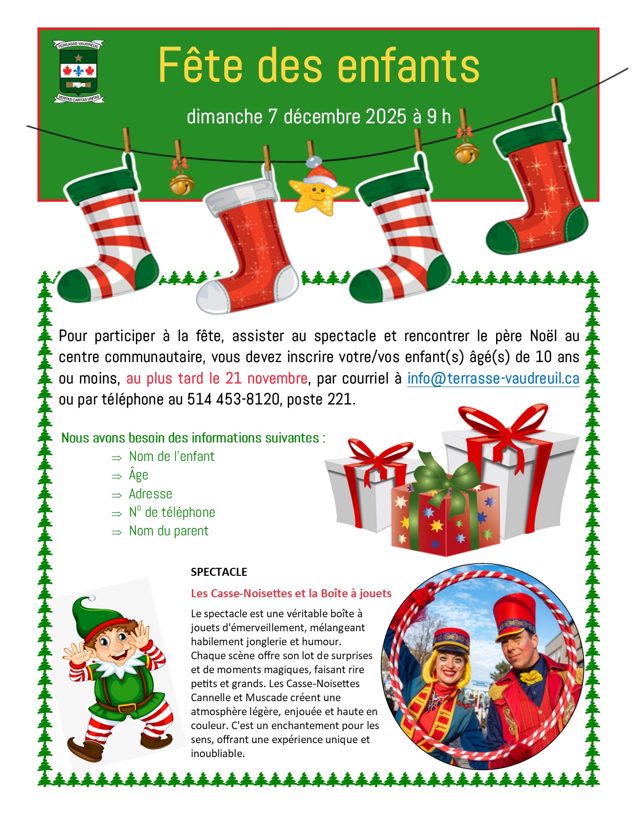 La date limite est dépassée pour l’inscription mais nous accepterons quand même les nouvelles demandes par courriel à info@terrasse-vaudreuil.ca jusqu’à 13 h, le vendredi 28 novembre. Après, il sera vraiment trop tard !